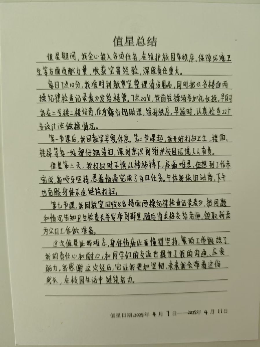这次值星让我难忘,身体伤痛让我懂得坚持,繁琐工作锻炼了我的责任心与耐心,和同学们的交流也提升了我的沟通、应变能力。我感谢这次经历,它让我更加坚韧,未来我会带着这份成长,在校园生活中继续努力。