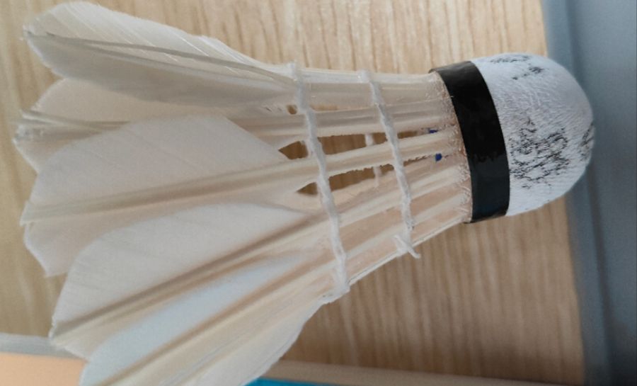 白色的羽毛球,像一朵轻盈的小雪花,却藏着大大的活力。它的球托是橙红色的软胶,摸起来圆润有弹性,周围裹着一圈细密的白色羽毛,层层叠叠排得整整齐齐,风一吹就轻轻颤动。