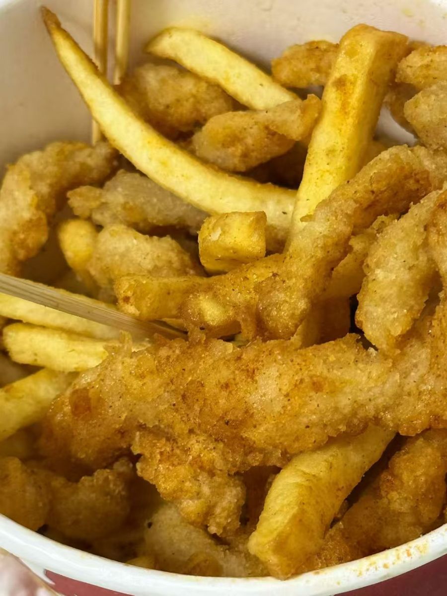 这碗金黄油润的小吃,是裹满香酥外衣的鸡柳与薯条的“神仙组合”。刚出锅的鸡柳裹着轻薄脆壳,酥香裹满椒盐与细碾的香料碎,咬开是嫩白的鸡肉,汁水顺着纤维漫开;旁边的薯条炸得外脆里绵,边角泛着焦香,裹着同一份调味粉,咸香里裹着淡淡的辛香。白色纸碗衬得金黄更鲜亮,几根竹签斜插在堆得冒尖的食料里,油光浅浅浸在碗底,勾得人喉间发紧。这是街头小吃摊最讨喜的搭配——鸡柳的软嫩裹着脆壳,薯条的绵密裹着焦香,一口鸡柳一口薯条,咸香在舌尖叠成热乎的烟火气。不必讲究吃法,竹签挑起裹满调味的鸡柳,指尖捏起烫嘴的薯条,油脂香混着香料味在空气里漫开,是放学路上、逛夜市时最贴胃的慰藉。热乎的脆、软嫩的鲜,裹着市井里最直白的美味,一口接一口,把平凡日子里的小满足,都裹进这碗油香扑鼻的热闹里。