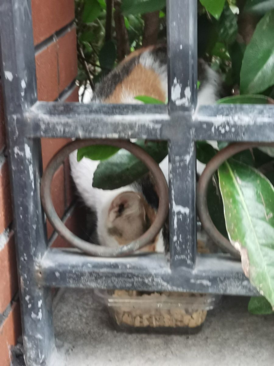 它大概是校园里的“常住民”吧?藏在绿植间,揣着满肚子的慵懒,却又偷偷探出脑袋,把软乎乎的可爱塞进我们的日常。
