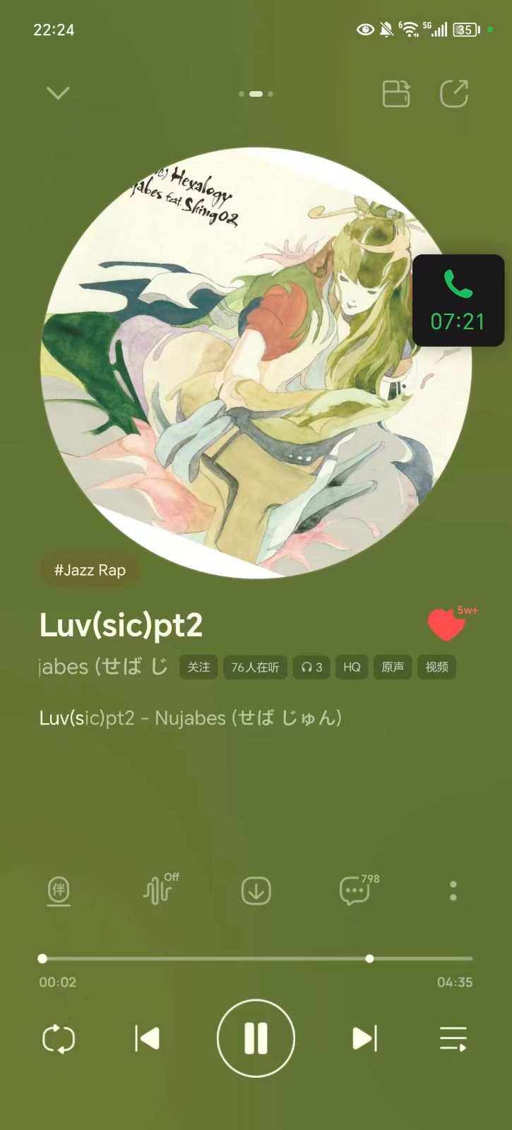 这是一张音乐播放界面的截图,歌曲为《Luv(sic)pt2》,由Nujabes(せば じゅん)创作,jubes(せば じ)参与演绎,标注了“#Jazz Rap”标签,说明歌曲融合了爵士乐与说唱音乐的元素。界面背景为深绿色,搭配专辑封面中央的插画,画面中是一位灵动的动漫风格角色,身着古风服饰,头戴飘逸的配饰,整体呈现出一种温柔且略带神秘的气质。