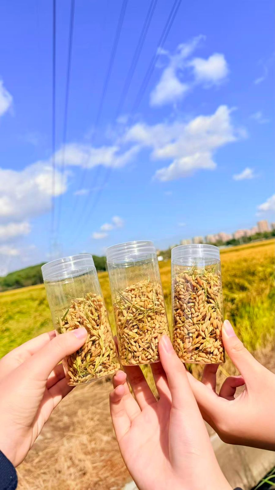今日阳光和煦,全校同学踩着轻快的脚步走进上海市嘉北郊野公园,一眼就被连片的金黄稻田撞进了心里——沉甸甸的稻穗压弯了秸秆,风一吹就泛起金色的波浪,这确实是课本里从未见过的生动画面。                                在农民奶奶手把手的指导下,我学着弯腰、对准稻秆根部下刀,割完水稻我们便开始打刚收割的稻穗,手握成束的稻秆,朝着竹筐用力向下甩打。                这次秋游根本不是“游玩”,而是一次超有意义的成长课——“米的一生”。我不仅亲手触摸了粮食生长的模样,更懂了“一粥一饭当思来之不易”的分量。这样的经历,比任何风景都更让我难忘。