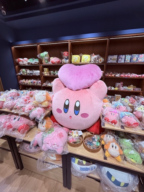 周围的货架和长桌更是“卡比宇宙”的狂欢:透明包装袋裹着圆滚滚的卡比抱枕,有的蜷成睡颜、有的顶着小花,连旁边的小摆件都沾了粉乎乎的气息;后方的木质货架上,超级马里奥的绿恐龙、问号方块混着其他卡通玩偶,像把好几部动画的快乐都攒在了这儿,包装好的盒玩整整齐齐码着,透着细碎的精致。