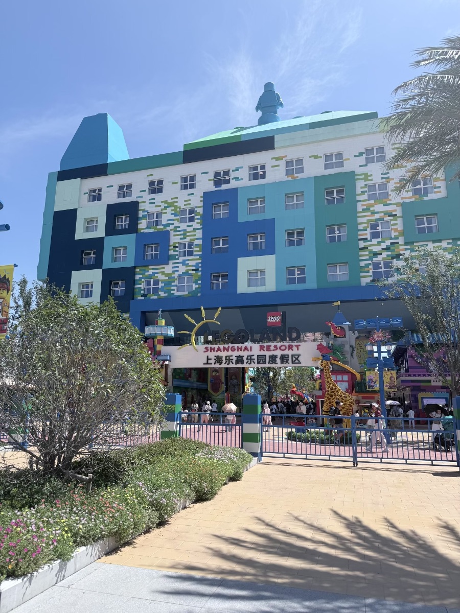 这张图片展示了上海乐高乐园度假区的场景。建筑外观色彩丰富,以蓝、绿、白为主色调,像由乐高积木拼接而成,顶部还有乐高小人造型。入口处的招牌清晰写着“LEGOLAND SHANGHAI RESORT 上海乐高乐园度假区”,周围有乐高风格的装饰,比如长颈鹿造型的装置。园内游人不少,有的在游玩,有的在漫步。前景有绿植花卉和树木,地面铺着砖石路,蓝天映衬下,整个度假区充满童趣与活力,洋溢着欢乐的氛围。