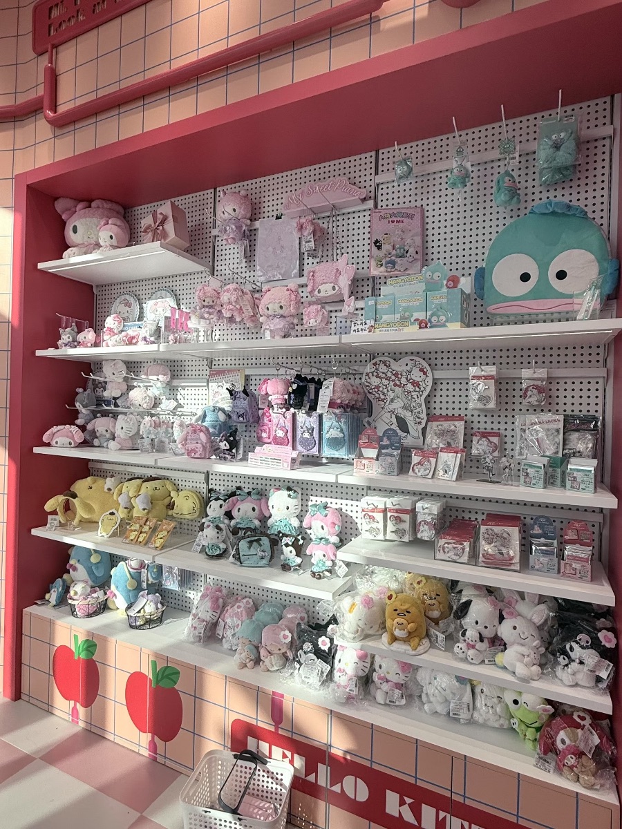 这是一间周边商店。墙面以粉色为主,搭配网格板和白色货架,陈列着大量三丽鸥系列周边,有Hello Kitty、美乐蒂、布丁狗等角色的毛绒玩偶,造型多样且粉嫩可爱。还有文具、挂件、背包等物品,色彩缤纷。底部墙面是带有红色苹果图案的瓷砖,地面是粉色系拼砖,角落的白色购物篮增添了几分生活气息。整体布置温馨甜美,各类萌趣周边琳琅满目,仿佛一个童话般的小天地,很能吸引喜爱可爱风的消费者。