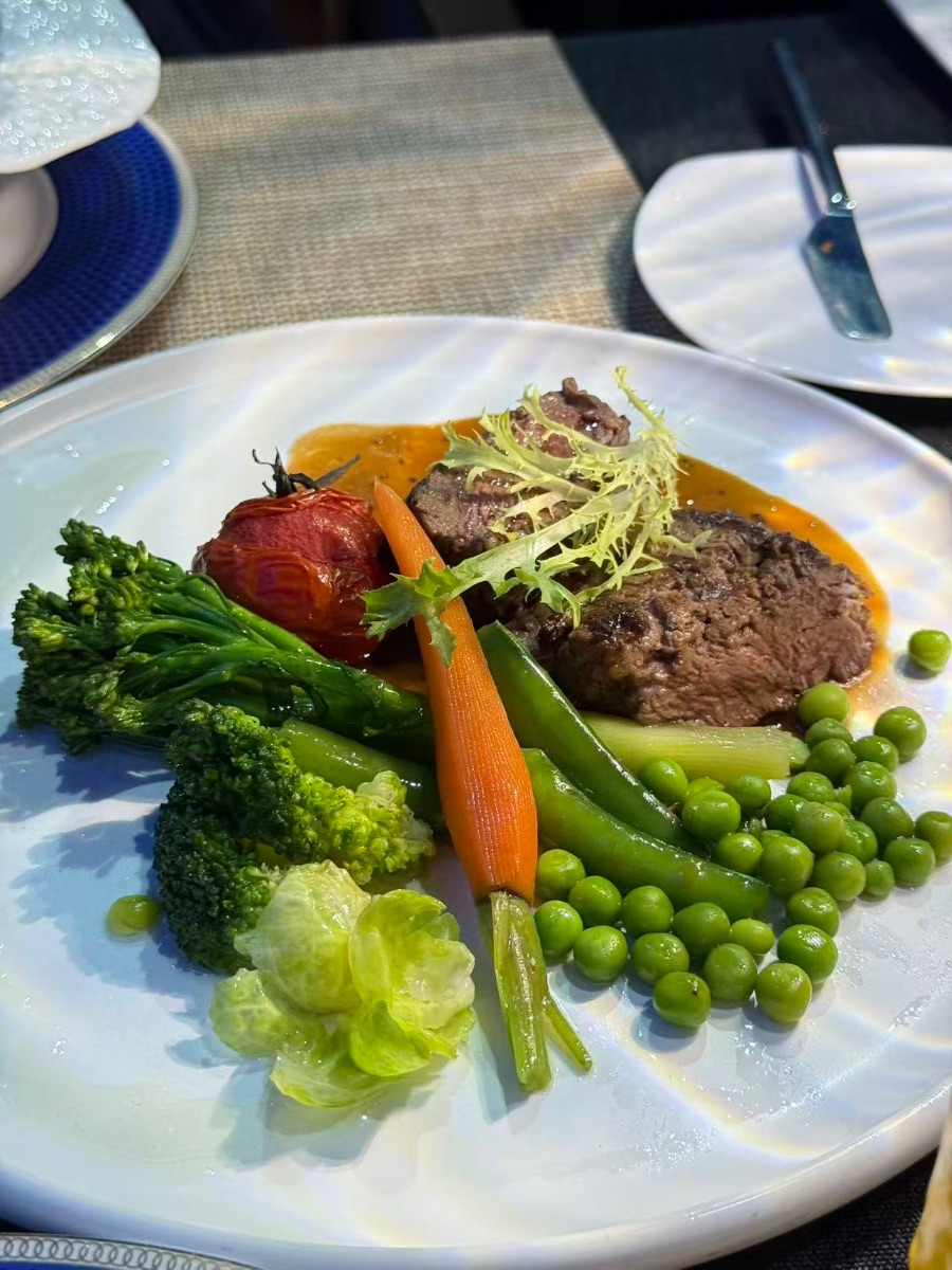 这盘牛排餐无疑是一场视觉与味觉的双重奢享。牛排被精心烹制,表面呈现出诱人的焦褐色,切开后,粉嫩的肉质纹理清晰可见,软嫩的质感仿佛轻轻一抿就能化开。醇厚的酱汁均匀地裹在牛排上,每一口都能尝到肉汁与酱汁的香浓融合,咸香中带着一丝独特的风味。周围的配菜更是别出心裁,翠绿的西兰花鲜嫩脆爽,圆润的豌豆清甜可口,橙红的胡萝卜条软糯入味,还有那颗烤得外皮微皱、内里多汁的番茄,以及点缀的新鲜生菜丝,色彩缤纷且营养均衡。在精致的餐盘与优雅的用餐环境衬托下,这道牛排餐不仅是食物,更像是一件艺术品,每一口都能感受到厨师的用心,让人在品味美味的同时,也享受着精致的用餐仪式感。