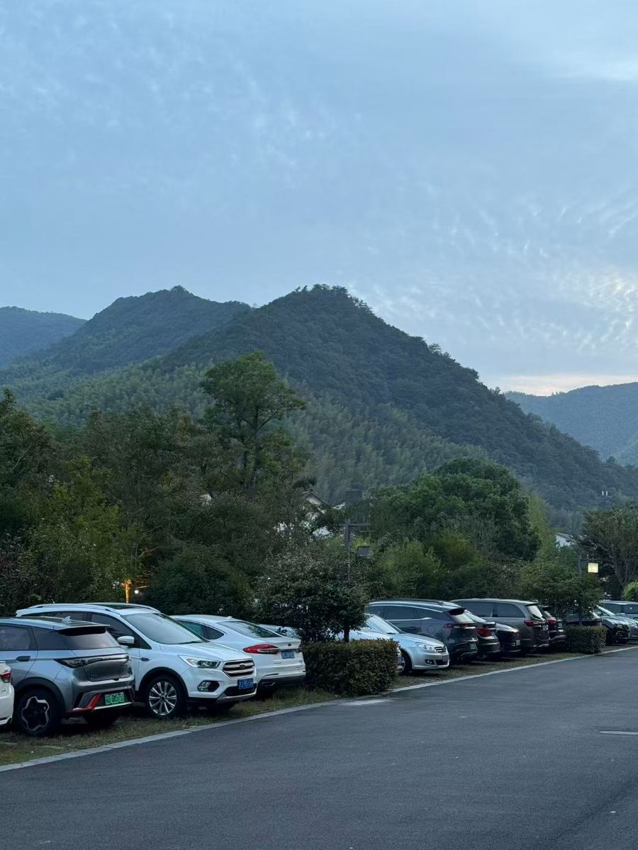 这张照片捕捉了你和家人一起去农家乐游玩的美好时光。画面中,几辆汽车整齐地停放在停车场,显示出这是一个受欢迎的休闲地点。背景是连绵起伏的青山,山峦在薄雾中若隐若现,增添了一份神秘和宁静。山上的树木郁郁葱葱,显示出大自然的生机勃勃。天空呈现出淡淡的蓝色,几朵白云悠闲地飘过,预示着一个晴朗的日子。这样的景色让人心情愉悦,期待在农家乐中享受自然的乐趣,体验乡村的宁静与和谐。这张照片不仅记录了美丽的自然风光,也见证了家庭的温馨时刻。