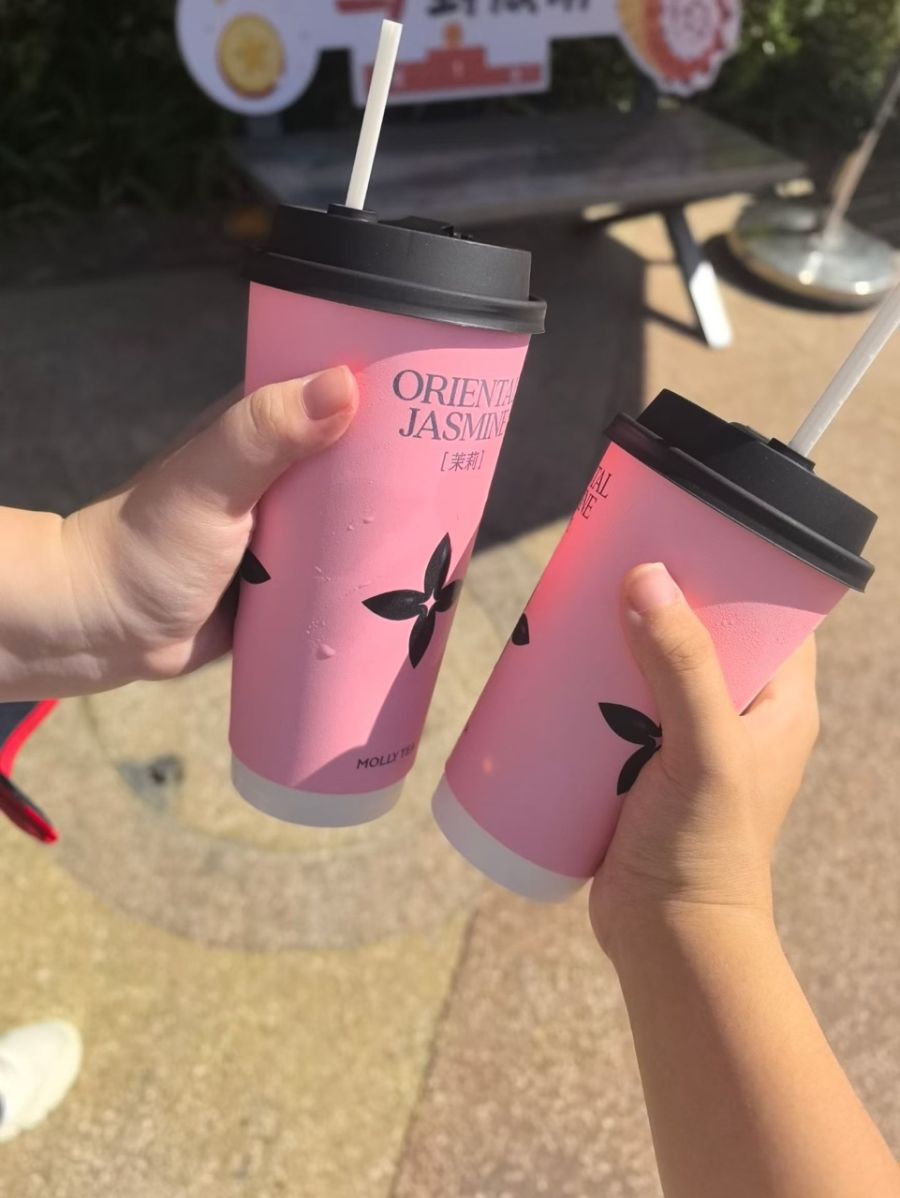 杯子上写着“ORIENTAL JASMINE [茉莉]”,让人联想到茉莉花的清香。背景是一个户外的场景,阳光洒在地面上,给人一种温暖而舒适的感觉。远处还有一些装饰性的标志,像是在某个公园或景点,增添了几分悠闲的氛围。