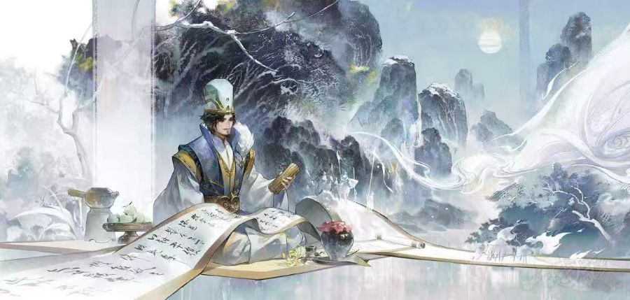 图中于水墨山川间展卷沉思的白衣谋士,正是袁绍帐下首席谋臣——沮授。他头戴高冠,衣袂染着霜雪,案上散落的竹简与茶盏,映照着这位“冀州洞鉴者”对天下大势的深刻洞察。身后云雾缭绕的群山,恰似他一生困于乱世迷雾的命运写照。