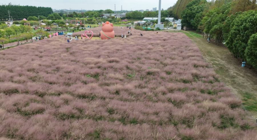 这周的秋游去了嘉定郊野公园,没想到最美的风景需要走够四十分钟才能遇见。入园后我们沿着林荫道走了好久,两边是寻常的树木草地,正当脚步开始发沉时,转过一个弯,整片粉黛乱子草就这样毫无防备地撞进眼里——比想象中还要壮观。那粉色像被稀释过的晚霞,又像大地呼出的一团温柔的雾。最妙的是,花田里还精心设计了几处打卡点,有用粉黛草围成的巨大爱心拱门,人站在中间,就像被秋天轻轻拥抱在怀里。
