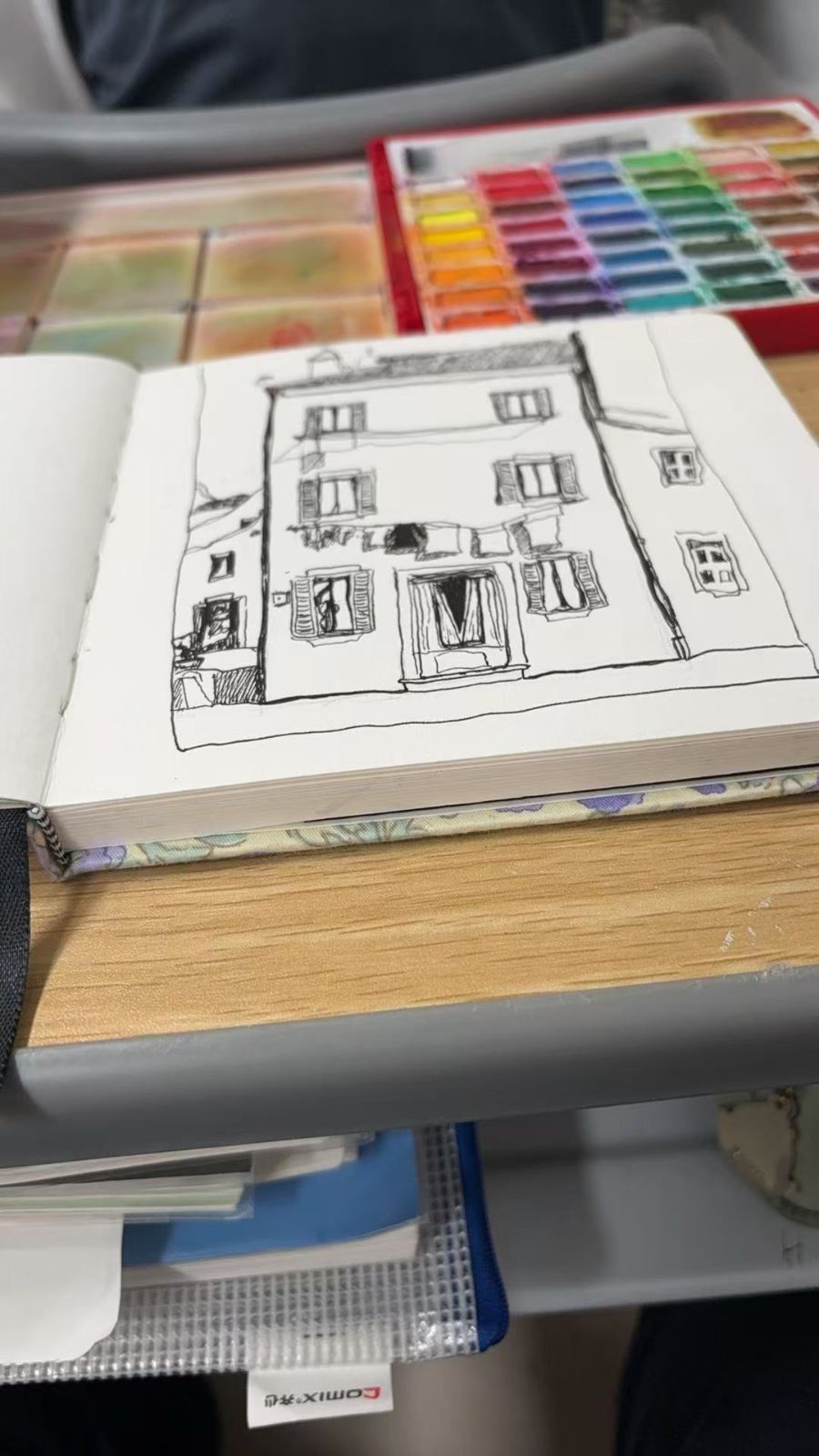 斜阳把整条老街切成明暗两段,老师夹着画板带我蹲在拐角,说“先眯眼,找大块”。他铅笔横举,像木匠吊线,几笔就搭出屋脊的斜势。我跟着炭条乱戳,线条像被风吹跑。老师按住我手腕,把笔放倒,让侧锋在瓦沟里滚,一排乌瓦立刻有了呼吸。他示范透视,把墙脚推远,又把烟囱拎高,像给房子戴上歪帽。我学着把窗框画斜,他笑说“歪得正好,是老木头自己扭的”。十分钟,两栋小屋在纸上握手,影子叠成一片。老师拍拍纸屑,说速写不是抄,是给房子挠痒,让它笑出来。我抬头,看余晖正给真房子披金,像纸上的线也发了光。