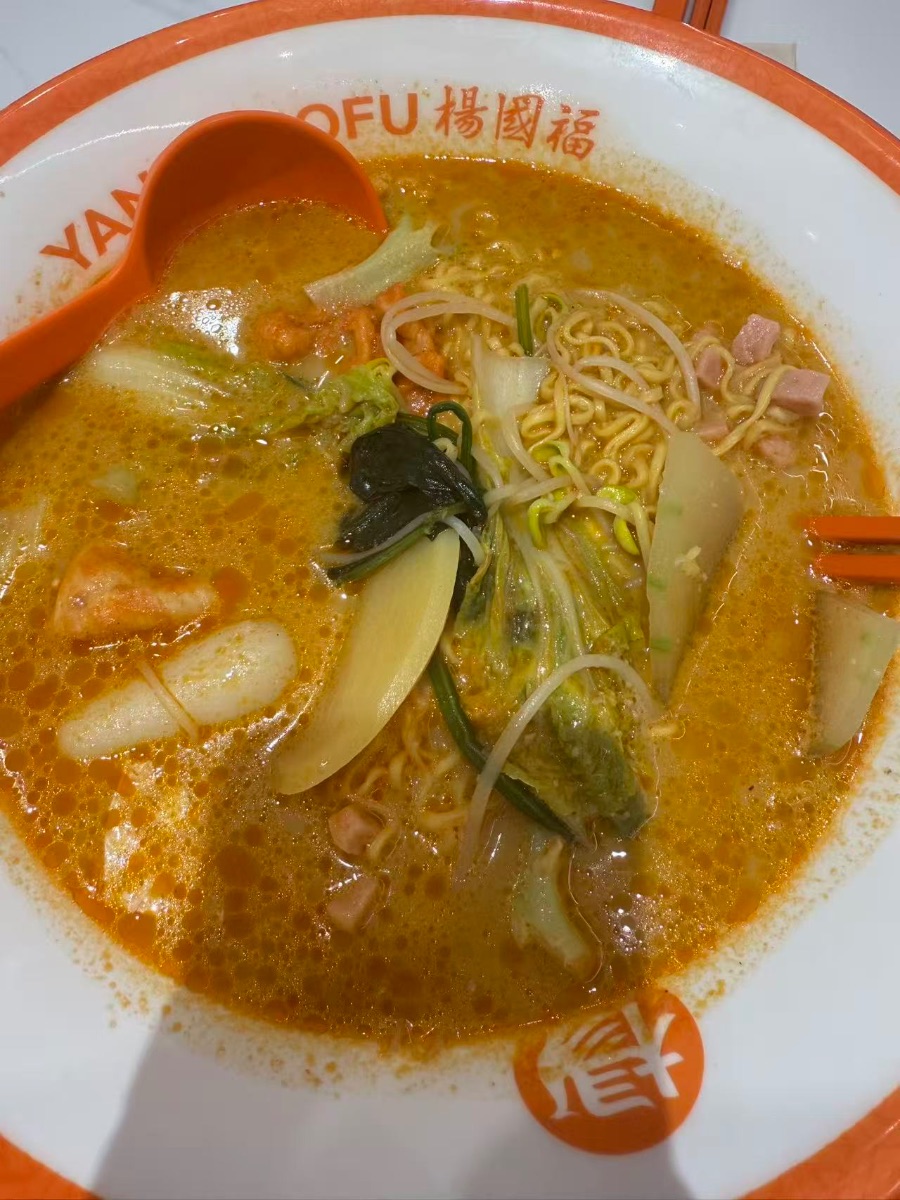 橙白碗沿上“杨国福”三个字刚入眼,鼻尖先裹上了红油汤底的暖香。浓汤浮着细碎的辣油,把泡面、娃娃菜、火腿丁浸得油润发亮——夹一筷子卷着汤汁的豆芽,脆爽裹着咸鲜先占满口腔,泡面吸饱了汤底的醇厚,嗦进嘴里时热乎气顺着喉咙滚进胃里。嫩白的笋片浸在暖黄的汤里,连塑料勺碰着碗沿的轻响,都裹着市井里的踏实劲儿。没有精致摆盘的讲究,只有食材裹满汤汁的实在,一筷子下去攥住的,是忙碌日子里最直白的热乎满足,连鼻尖沾的细汗都透着痛快。
