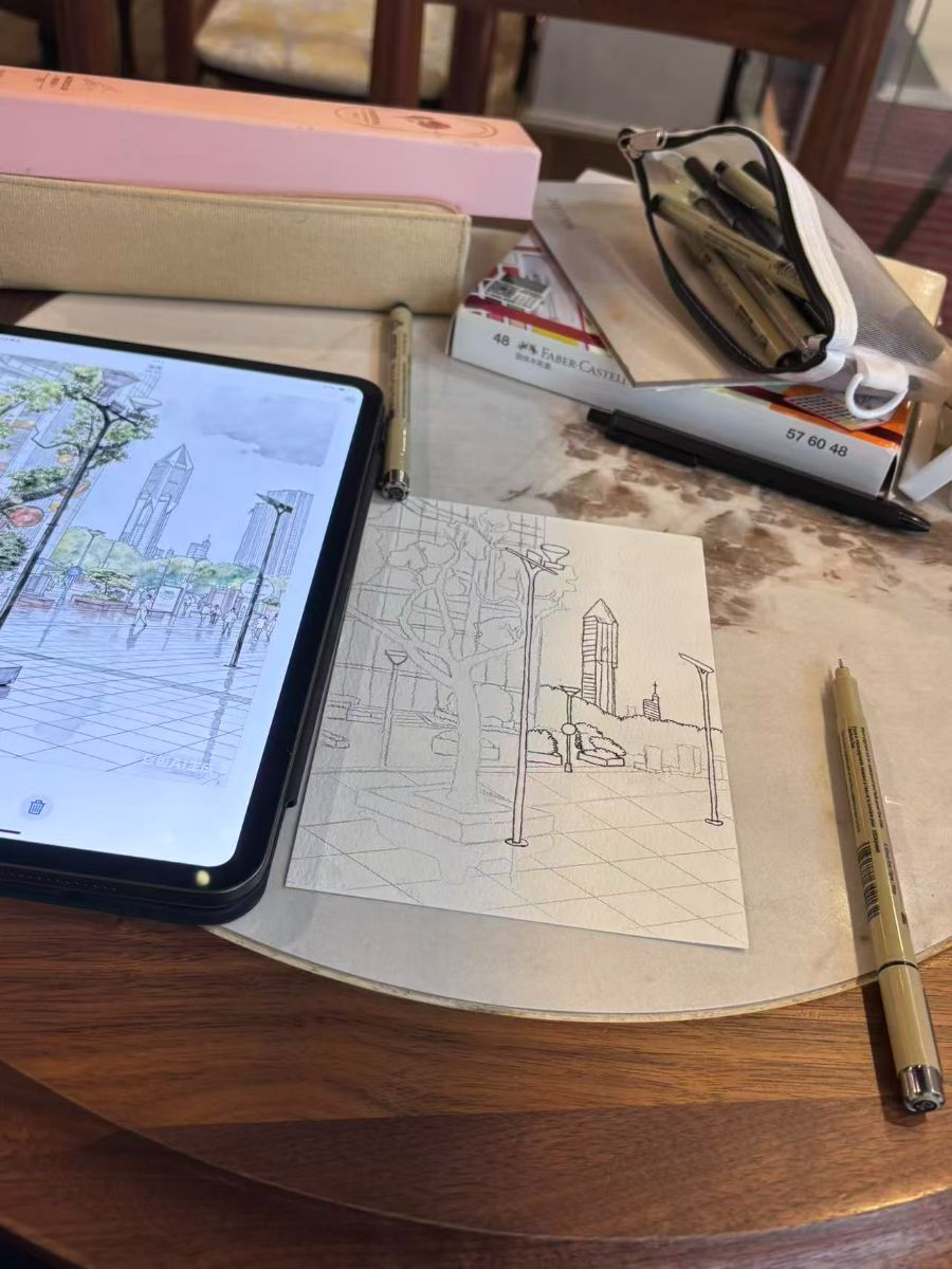 风里裹着咖啡香与老字号糕点的甜,偶尔有路人驻足轻声点评,陌生的善意让笔尖更添温度。专注于光影流转间,外界的嘈杂渐渐远去,只剩画笔与纸面的摩挲。这一刻,我不是过客,而是以笔墨为桥,定格下这条老街的烟火与风华,也读懂了它在时光中不变的生机。