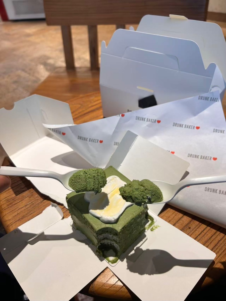 刚在店里挑了块抹茶蛋糕,坐下拆开DRUNK BAKER的白包装时,指尖还沾着纸盒的软韧质感。蛋糕方方墩在纸托上,深绿的糕体裹着浅一层的抹茶奶油,顶上加了勺蓬软的奶油,边缘已经被我用勺子挖开一块——挖起来的那团抹茶糕体裹着细密的气孔,看着就软乎乎的,勺子边缘还蹭了点深绿的粉屑。