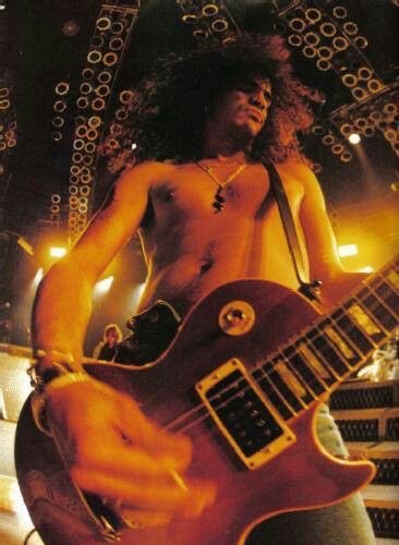 Slash的演奏姿态自成一格,蕴含着耐人寻味的艺术辩证法。他微微屈膝前倾的体态,既保持着演奏者必备的稳定感,又暗含着随时迸发的张力,恰似中国书法中"欲右先左"的运笔之道。那柄低垂的吉他与身体构成精妙的黄金角度,恍若古典乐者沉浸于巴洛克乐章时的忘我神态,又带着现代摇滚特有的不羁灵魂。