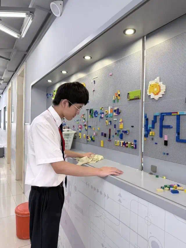 上课铃声响起后,同学们陆陆续续都进入了教室,我便开始按照要求进行楼面的巡查与简单的清洁维护工作。我沿着楼道缓缓前行,眼睛像扫描仪一样仔细查看地面,只要发现有小纸片或者其他小垃圾,就赶紧弯腰捡起来,丢进就近的垃圾桶里。随后又查看了楼道两侧的窗台,要是沾上了灰尘,就掏出随身携带的抹布认真擦拭干净,确保窗台一尘不染。对于栏杆部分,也不放过,一点点地检查擦拭,让整个楼面公共区域都能保持整洁的模样。