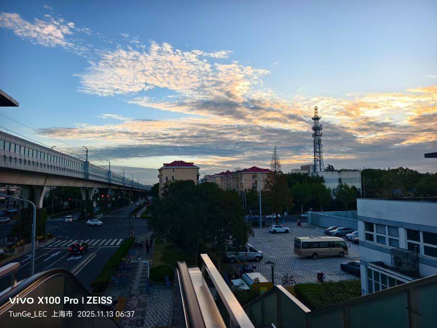 清晨六点半的风裹着朝霞,把云絮染成了揉碎的金箔。高架轻轨擦着楼宇掠过,车轮声裹在风里,和马路上的车流声叠成早高峰的序章。红顶居民楼刚醒,树影还浸着晨露,路边的共享单车歪歪扭扭,像刚睡饱的我们。赶早的行人裹紧外套,车流里的车灯亮得像碎星——这是城市最温柔的开场,没有上课铃的催促,只有朝霞铺在肩头,把上学路揉成了裹着暖光的日常。
