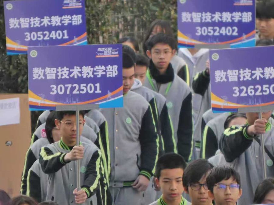 当天早上六点四十五,以王宸羽为首的十名参加方阵同学便在操场上顶着寒风进行最后一轮方阵彩排。他们代表班级在数智教学部的方阵队伍中高声呐喊口号,顺利完成了运动会开幕式入场与广播操比赛的任务。