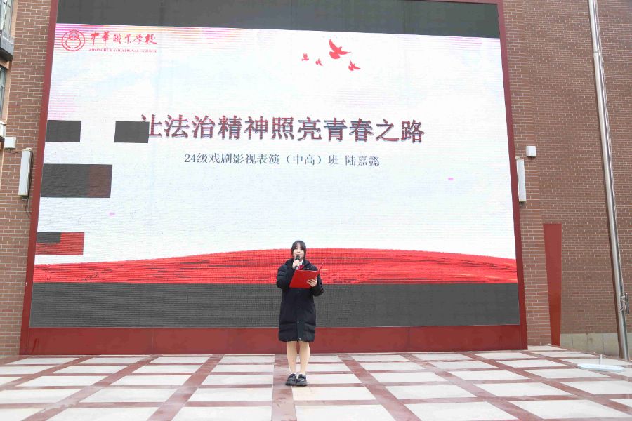 升旗仪式后,24戏影专业的陆嘉懿同学作为学生代表发表题为《让法治精神照亮青春之路》的国旗下讲话。她结合校园生活与成长经历,用生动的案例阐释了“法律就在身边”的道理,指出课堂守纪、诚信待人、文明出行等日常行为都是法治精神的具体体现。她呼吁同学们将法律作为“内心标尺”与“行动自觉”,主动学法知法,自觉守法用法,以青春之力守护法治信仰,为法治校园建设添砖加瓦。发言真挚有力,引发了全体师生的强烈共鸣。