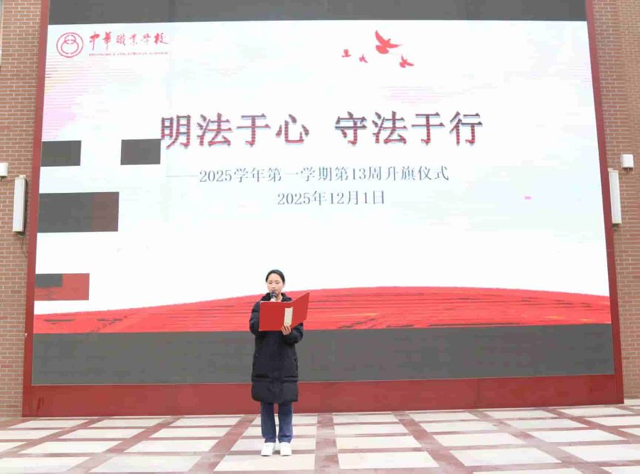 为深入学习宣传贯彻习近平法治思想,迎接我国第十二个国家宪法日及2025年全国“宪法宣传周”,12月1日,我校隆重举行以“明法于心 守法于行”为主题的第13周升旗仪式。本次仪式由徐蔡悦同学主持,全体师生共同参与,在庄严的氛围中感悟宪法力量,厚植法治信仰。