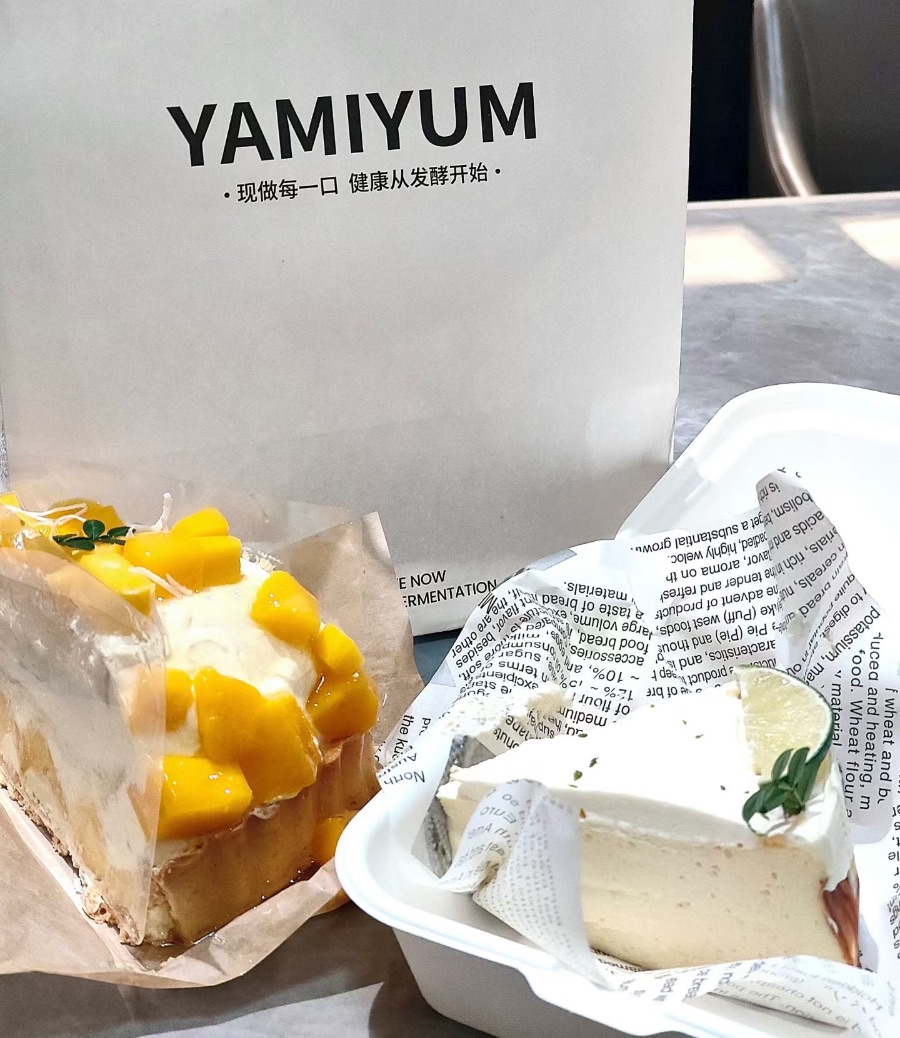 这是“YAMIYUM”的甜点——光看包装上“现做每一口 健康从发酵开始”的slogan,就能猜到是主打新鲜与轻负担的烘焙店。
