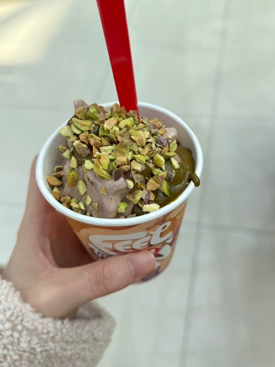 握着DQ的纸杯,指尖先触到冰凉的杯壁,随即撞进满眼的开心果碎——翠生生的碎粒密密匝匝裹着浅棕的巧克力冰淇淋,像给浓醇的可可撒了把春日的碎光。挖一勺送入口中,冰淇淋的绵密先在舌尖化开,微苦的巧克力尾调混着开心果的坚果香,又添了几分醇厚的层次。杯底还藏着丝滑的酱芯,咬开时顺着冰淇淋缓缓淌下来,甜而不腻的滋味在口腔里漫开。红勺子戳着冰淇淋打转,阳光斜斜落在杯沿,杯身的花纹被晒得暖融融的,连风里的凉意都被这口甜柔化了。此刻手里攥着的不只是一杯冰淇淋,是秋冬街头