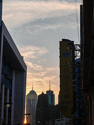 外滩方向的天际,正上演一场恢弘的告别。赭红、金橙与玫瑰紫如打翻的熔金,从海关钟楼尖顶倾泻而下,漫过万国建筑群的轮廓,将整条南京路镀上一层流动的暖光。连叮当作响的有轨电车、步履匆匆的行人,都在这片光瀑中成了剪影,轮廓边缘燃烧着毛茸茸的金边。