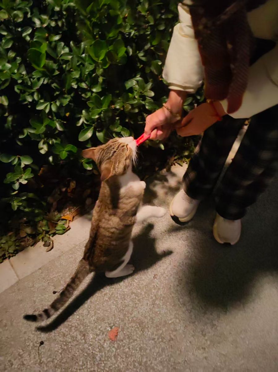 夜晚的路灯在地面投下暖黄的光晕,一只虎斑白脚的小猫站在灰色的水泥路面上,成了这方小天地里最鲜活的主角。它后腿稳稳蹬着地面,前爪微微抬起,整个身子抻得笔直,脑袋使劲向上仰着,鼻尖几乎要碰到人手中的红色小物件,棕色的斑纹在光影里晕开深浅不一的纹路,白色的胸毛和爪子在夜色中格外显眼。