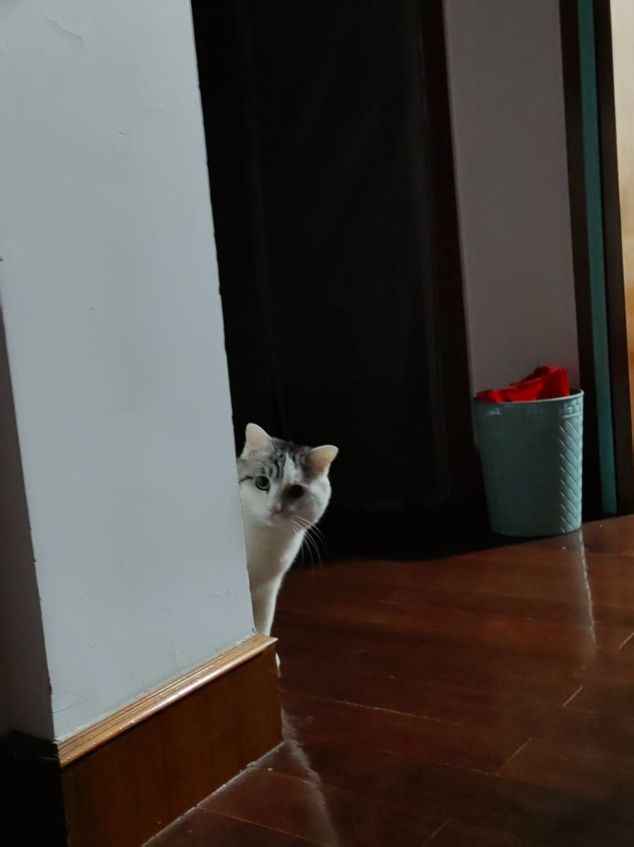 墙角边探出的小脑袋,像颗裹了奶白与浅灰斑纹的毛团子,悄悄扒着米白色的墙柱打量着前方。猫咪的一只圆溜溜的琥珀色眼睛睁得溜圆,瞳孔微微缩着,带着几分警惕又好奇的劲儿,粉色的小鼻尖轻轻颤动,银白的胡须也跟着绷得笔直,仿佛在仔细捕捉周遭的每一丝动静。
