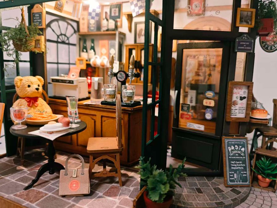 背景里木质橱柜嵌着琳琅的瓶罐与复古画框,绿框格窗旁垂着蕨类绿植,斑驳的招牌、菱格纹木椅与牛皮纸袋错落其间,每一处微缩摆件都勾勒出欧式小馆的慵懒氛围,像是把童话里的温馨角落,悄悄搬进了现实的方寸之间。