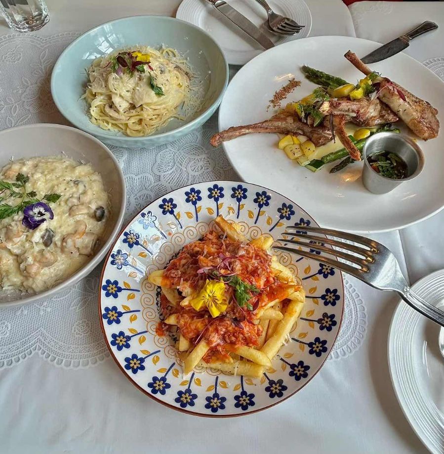 最吸睛的当属中间那只绘着蓝白花纹的瓷盘,金黄的薯条上铺着鲜红的酱料与刨花芝士,黄色的可食用花绽放在顶端,让寻常的薯条也变得高级起来。银质的叉子搭在盘边,金属的冷光与瓷盘的温润相映成趣,每一口都是对味蕾的温柔款待,从意面的绵滑到羊排的焦香,从烩饭的浓郁到薯条的酥脆,层次丰富的口感在舌尖依次绽放,这不仅是一餐美食,更是一场沉浸式的西式饮食美学体验。
