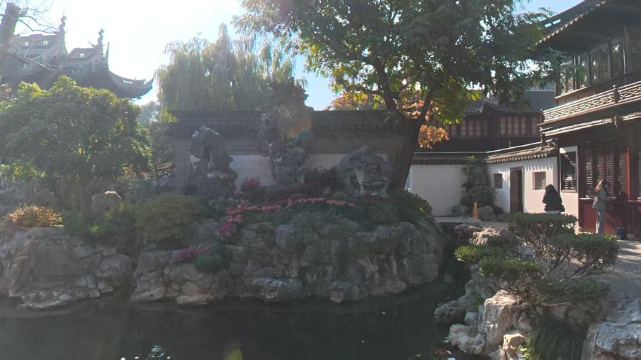 踏入豫园,便被江南园林的雅致牢牢吸引。青灰色的湖石堆叠成蜿蜒的假山,与澄澈的池水相映,阳光穿过枝叶洒在水面,漾起细碎的金光。白墙黛瓦的亭台依水而建,雕花的木窗、翘角的飞檐,处处藏着中式建筑的精巧。