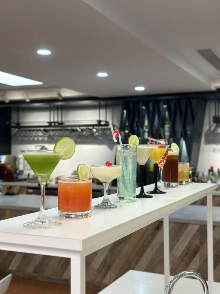 后方的酒品色彩从浅黄过渡到深棕,杯具样式各异,每一杯都凝聚着社员们的调配巧思。背景是简约的调酒工作室,金属器具与酒架若隐若现,冷调的工业风与鸡尾酒的鲜活色彩形成鲜明对比。整幅画面不仅展现了调酒社成员的专业功底,更将期末作业的用心与创意展现得淋漓尽致,满是青春对调酒技艺的热忱与探索。