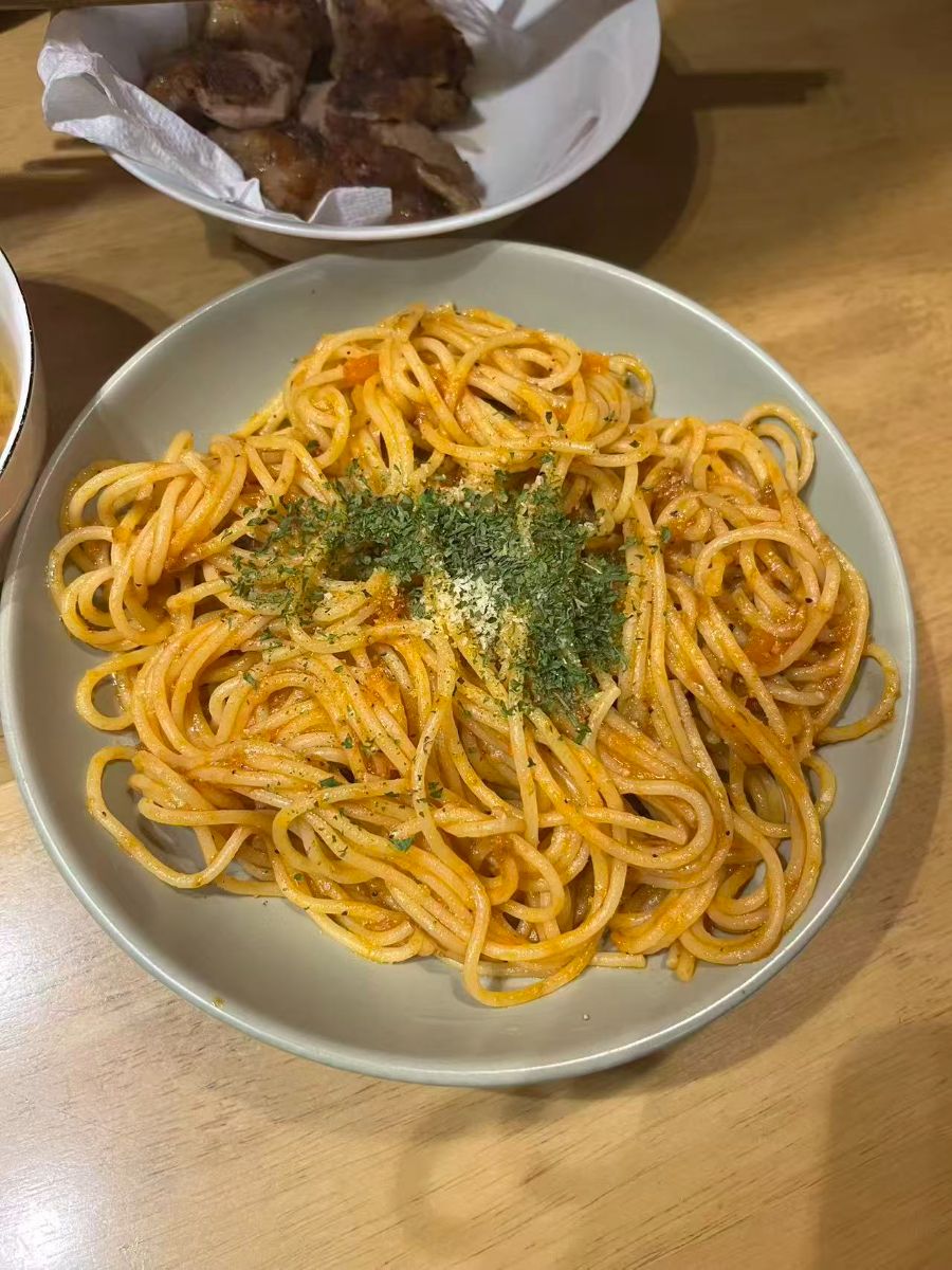 画面中,一盘番茄意面占据了视觉中心,浅灰色的圆盘衬得意面色泽愈发诱人。根根金黄的意面被浓郁的番茄酱汁均匀裹覆,泛着油亮的光泽,缠绕交织成蓬松的一团,看起来口感筋道弹牙。意面中央撒着翠绿色的欧芹碎,还混着些许白色的芝士粉,细碎的香料不仅丰富了视觉层次,更仿佛能让人嗅到酸甜酱汁与香草融合的香气。