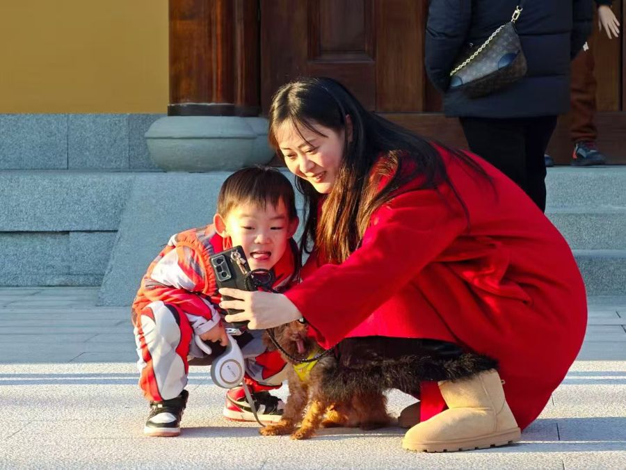 逛古寺时,撞见了特别温暖的一幕。穿红大衣的阿姨蹲在石阶旁,手把手教小男孩举着手机拍照,小男孩凑在屏幕前,嘴巴张得圆圆的,眼睛亮晶晶的,看起来兴奋又认真。脚边的小狗乖乖趴着,毛茸茸的身子蹭着两人的腿,在金灿灿的阳光下,像团软乎乎的小绒球。