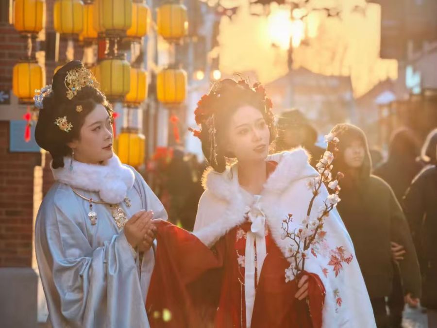 傍晚逛古街,被两位穿汉服的姐姐惊艳到了。暖金色的夕阳斜洒下来,给挂着的黄灯笼镀上了柔光,也把姐姐们的衣袂染得温柔。一位身着浅蓝汉服,领口的白狐毛衬得肌肤胜雪,金饰在发髻间闪着光;另一位红裙配白披风,手里捏着一枝梅花,花瓣与衣上绣纹相映,像从古画里走出来的人。