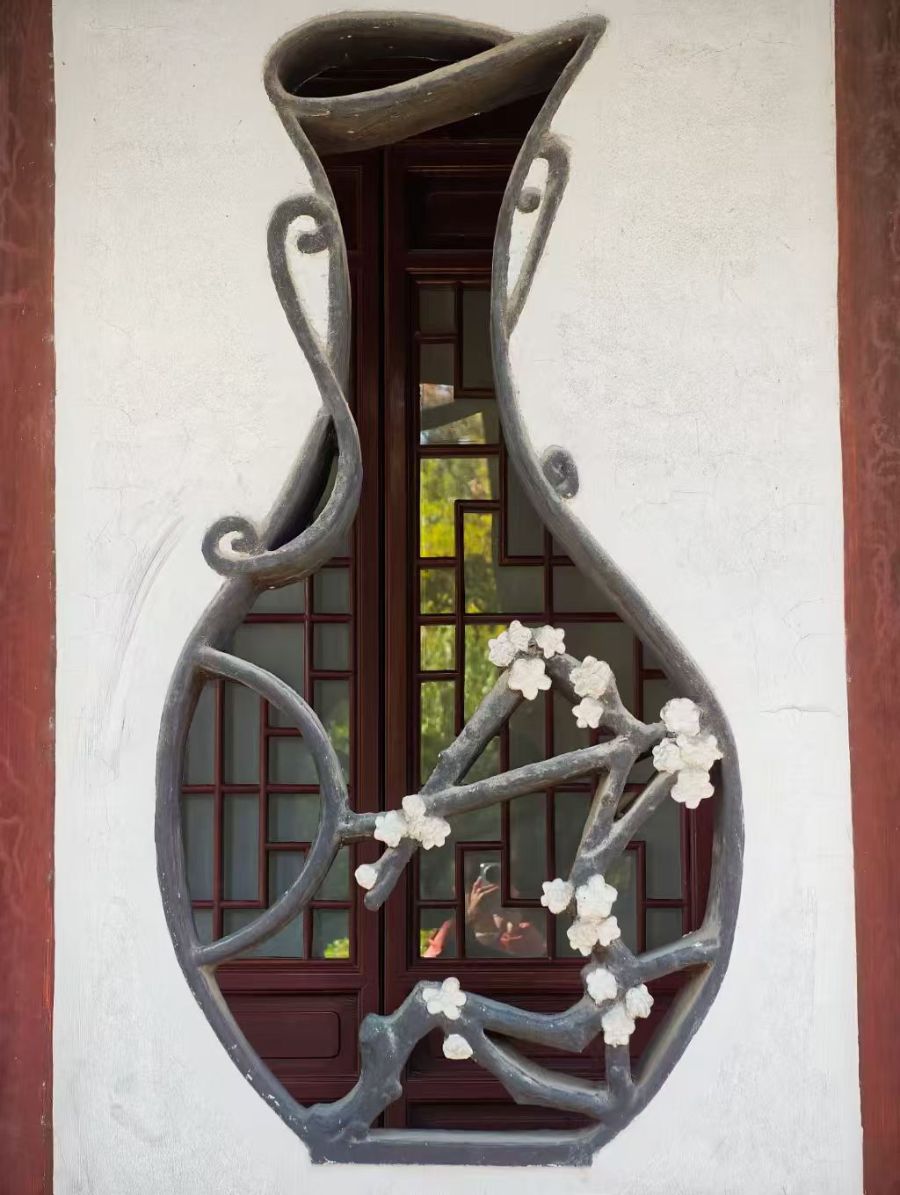 逛园林时,被墙上的瓶形花窗惊艳到了。青灰色的石雕勾勒出花瓶的轮廓,线条婉转灵动,瓶身里嵌着几枝白色梅雕,花苞玲珑,像真的在枝头绽放一般。花窗后是红棕色的木格窗,透过窗棂能看见外面的绿意,白墙、灰雕、红窗、绿影叠在一起,像一幅层次丰富的工笔画。