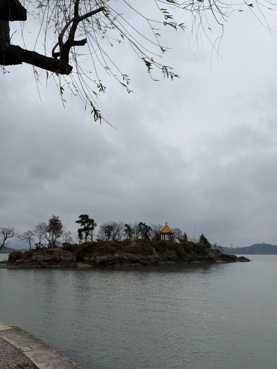 离了市声,登上鼋头渚。太湖水拍着石岸,哗——哗——,一声声,又慢又沉。天地忽然空了,只剩这亘古的呼吸。方才的暖色与喧嚷,都退成了遥远的背景。方才觉出,那园林的秀,街肆的闹,原是这浩渺水汽里,生出的最人间、最安稳的梦。