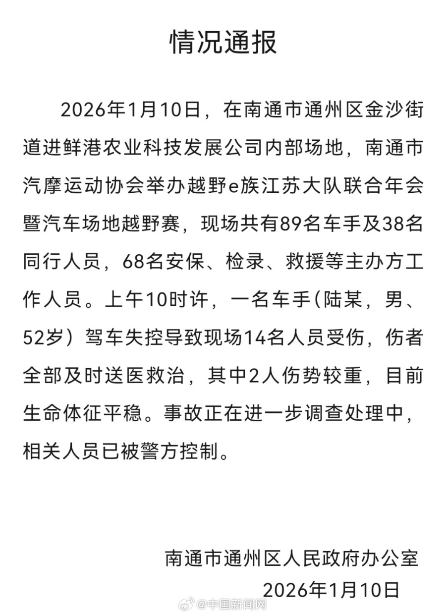 2026年1月10日上午10时,南通市通州区金沙街道一农业公司内部场地举办“越野e族江苏大队联合年会暨汽车场地越野赛”。52岁车手陆某在比赛中突然失控撞向人群,导致14人受伤(含观众、工作人员等),其中2人伤势较重但生命体征平稳。所有伤者已送医救治,涉事车手及主办方相关人员被警方控制,事故原因正在调查。