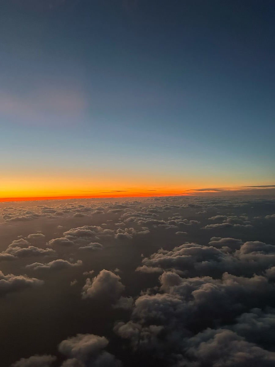 而地平线处,正铺展着一场盛大的橘色日落。浓烈的橙红熔金般淌在云海边缘,把云朵的轮廓烫上一层暖光,那些原本灰扑扑的云絮,瞬间被染成了橘粉、金红的模样,连空气里仿佛都飘着温柔的暖意。我靠着舷窗,指尖轻轻贴着冰凉的玻璃,看着那片橙红一点点往天际沉去,云朵的影子也渐渐被夜色吞没。