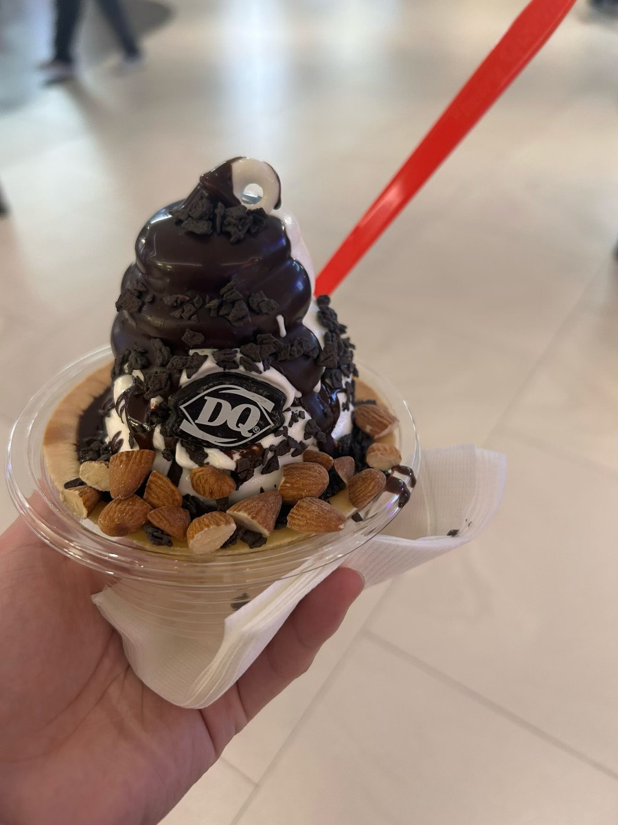 杯壁一圈铺着香脆的巴旦木碎,颗颗饱满,浅棕色的果仁带着坚果特有的油香,和巧克力、奶油形成了绝妙的搭配。我插上红色的长勺,轻轻挖下一勺,软冰淇淋的绵密、巧克力酱的醇厚、奥利奥的酥脆还有巴旦木的香脆,一下子在嘴里融合开来。冰凉的甜意从舌尖滑到喉咙,原本因为拥挤人群而烦躁的心情,瞬间被这口甜柔得一塌糊涂。