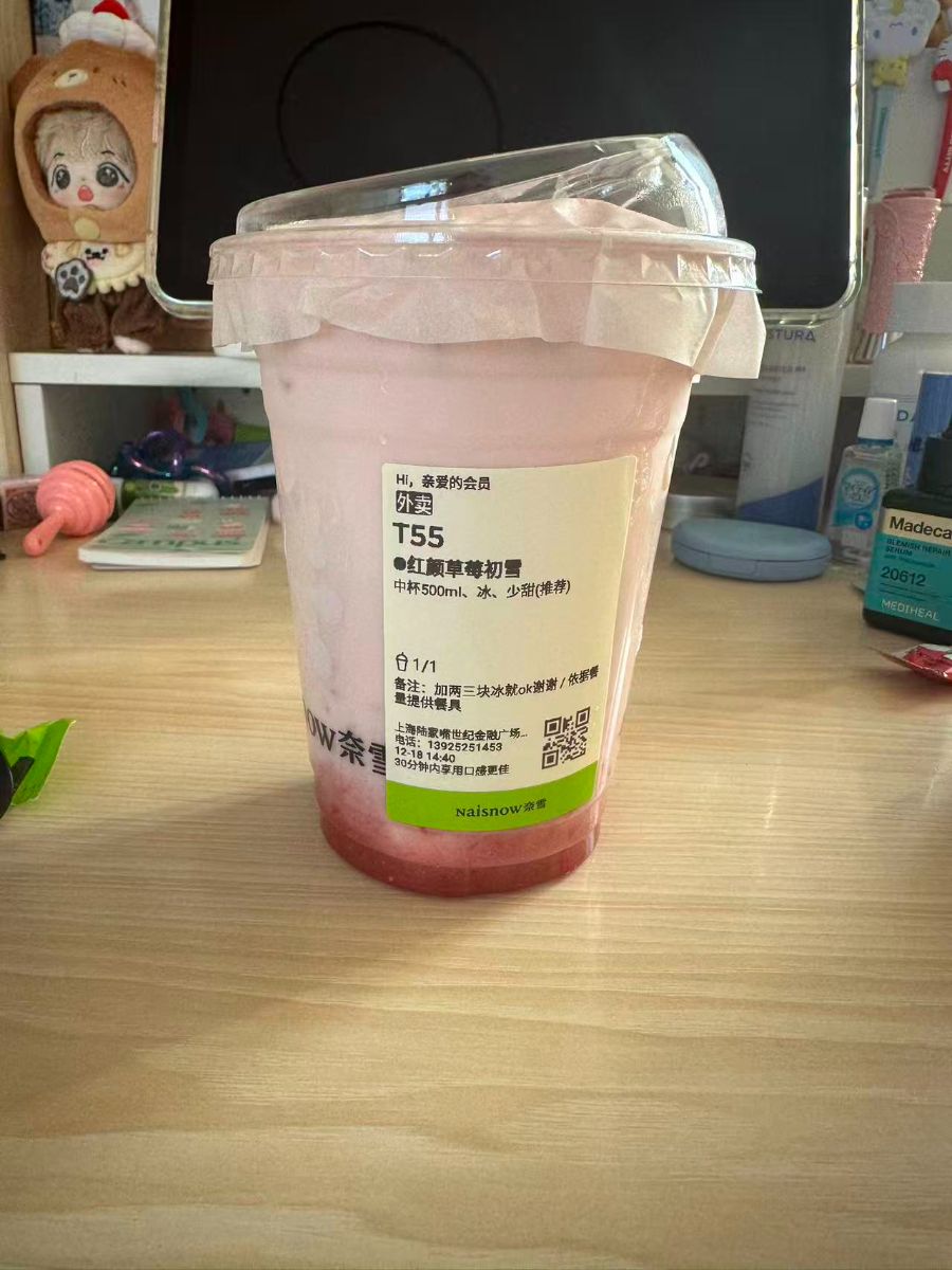 下午嘴馋点了奈雪的红颜草莓初雪,拿到手的时候粉粉嫩嫩的颜值直接戳中我的心巴!中杯500ml的容量刚好适合慢慢喝,浅粉色的冰沙混着底部的草莓果泥,杯壁上还挂着细密的冰珠。特意备注让商家加两三块冰,喝起来冰爽又不会太冰牙,少甜的甜度也刚刚好,不会腻得慌。吸一口,草莓的清甜在嘴里散开,冰沙细腻得像棉花糖,偶尔还能吸到果肉颗粒,口感超丰富。窝在书桌前,一边喝着草莓味的奶茶,一边整理旅游管理的笔记,连枯燥的知识点都变得可爱起来,果然草莓味的饮品永远是我的快乐源泉~