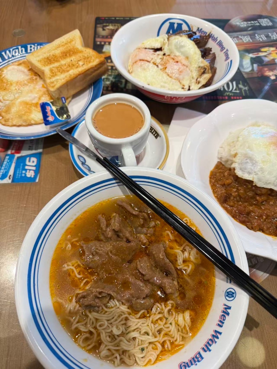 推开茶餐厅的门,港式午餐的香气便扑面而来。桌上的牛腩面汤色红亮,弹牙的公仔面浸在浓郁的汤汁里,嫩滑的牛肉片铺了满满一层,筷子挑起面时,汤汁挂在面条上,鲜味儿直钻鼻腔。旁边的餐碟里,烤得焦香的西多士边缘微脆,内里松软,搭配流心的煎蛋,甜咸交织得恰到好处。一杯丝滑的港式奶茶摆在中间,茶底的醇厚与奶的绵密融合,抿一口,茶香在舌尖散开。还有卤肉饭上卧着的溏心蛋,戳破的瞬间蛋液流进卤肉里,拌着米饭吃,每一口都是地道的港味烟火气,仿佛瞬间置身香港街头的茶餐厅,慵懒又惬意。