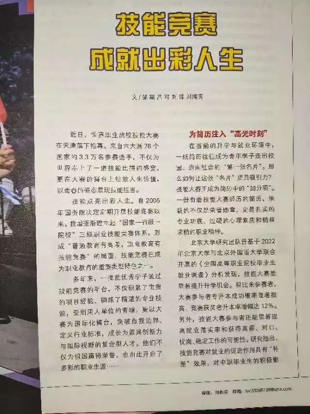 读《技能竞赛成就出彩人生》一文,我深受触动。世界职业院校技能大赛汇聚全球学子比拼技艺,让我看到技能不仅是安身立命的本领,更是绽放人生价值的舞台。职业教育的技能竞赛体系,为学子搭建了成长阶梯,参赛经历既夯实专业能力,又能为升学就业加码。这让我明白,不论身处何种赛道,只要深耕技能、勇于比拼,就能在属于自己的领域闯出天地,用专业本领书写出彩人生。