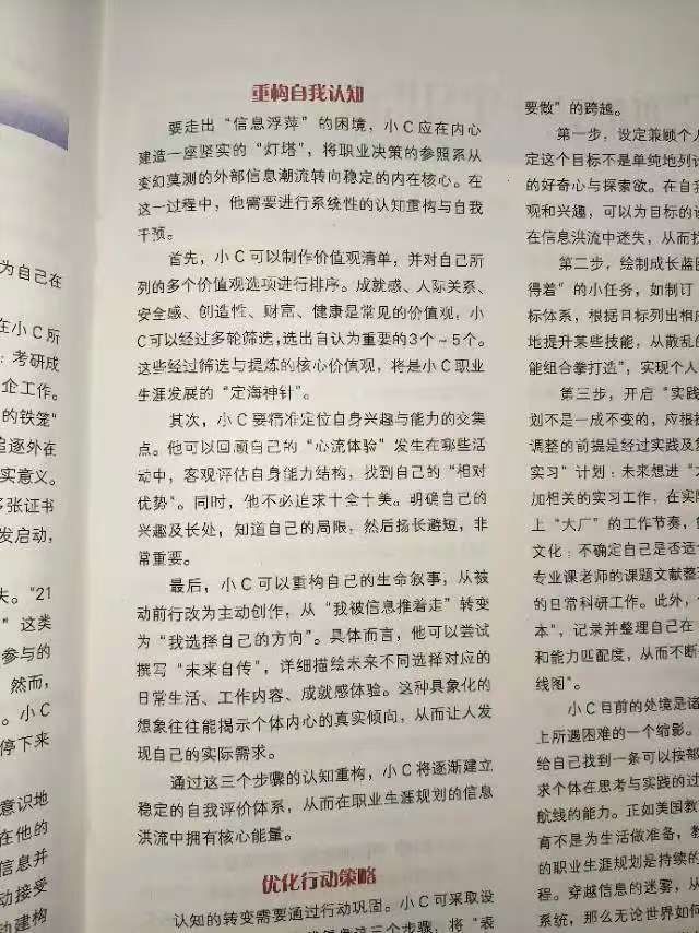 读《重构自我认知》一文,我对职业规划有了新思考。文中小C摆脱“信息浮萍”的方法,让我明白职业决策应锚定内在核心,而非被外界信息裹挟。制作价值观清单、找准兴趣与能力交集、重构生命叙事,这三步帮人建立稳定的自我评价体系,在信息洪流中站稳脚跟。这也提醒我,规划未来不能盲目跟风,要向内探索、主动实践,用清晰的自我认知为职业道路筑牢根基,才能从容应对人生选择。