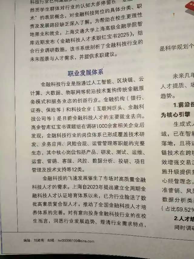 读金融科技职业发展体系相关文章,我对这一行业有了清晰认知。原来金融科技并非抽象概念,而是融合AI、区块链等技术的创新领域,岗位覆盖技术研发、风险合规等多维度。行业对复合型人才的需求,以及上海搭建的人才培育体系,让我看到该领域的发展潜力。这也提醒我,想要投身金融科技,需先摸清行业需求与岗位特点,结合自身优势夯实专业能力,才能在这一新兴赛道找准职业方向,实现精准择业。