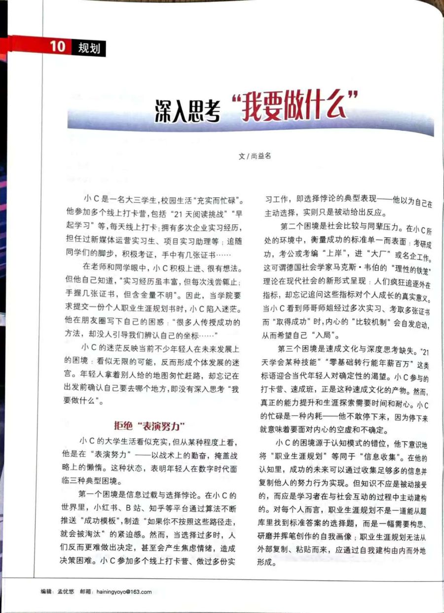读了这篇文章,我收获很大。文中为像小C一样迷茫的年轻人指出了职业规划的方向,从重构自我认知到优化行动策略,每一步都很实用。作为物流专业的学生,我也常纠结未来方向。现在我明白,要先明确自己的核心价值观、兴趣和能力,再设定目标、绘制蓝图,通过实践复盘调整。就像文章说的,职业规划不是照搬别人,而是自我对话与探索的过程。我会试着用这些方法,找到适合自己的物流职业发展路径,让脚步更坚定。