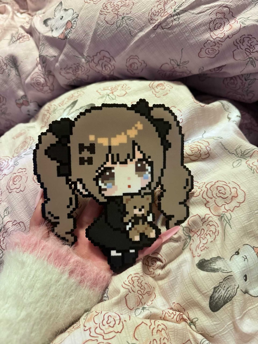 拼豆作品以颗粒感的像素块构成,每一颗豆子都精准排列,还原出二次元角色的Q版神韵,是当下流行的手工DIY形式。创作者通过色彩搭配与造型设计,将少女的软萌气质与复古像素美学结合,既保留了动漫角色的灵动,又赋予作品手工温度。这类拼豆手作常被用作钥匙扣、冰箱贴或桌面摆件,兼具装饰性与纪念意义。背景的碎花床品与毛绒袖口,更衬托出作品的温柔治愈感,仿佛将二次元的可爱瞬间定格在指尖,是小众又充满心意的手作礼物选择。