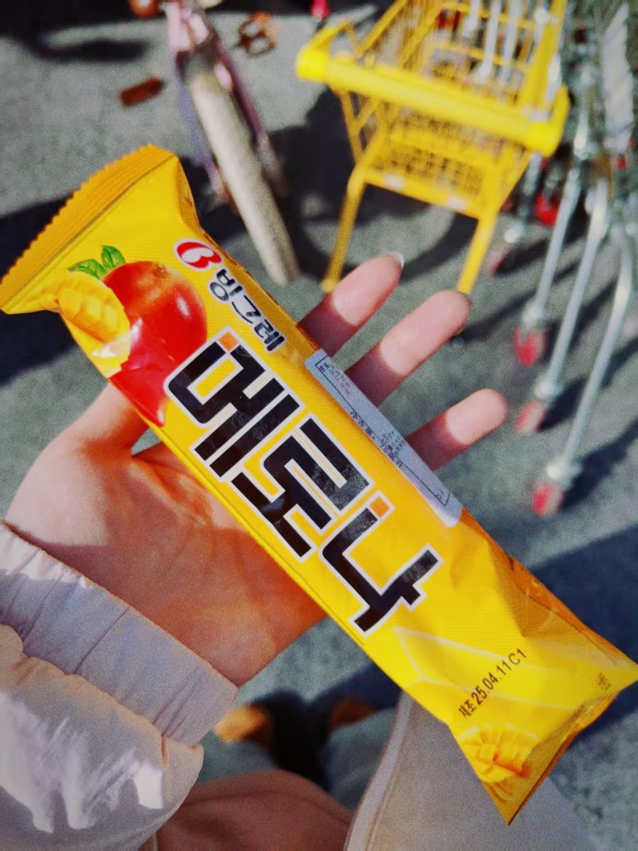 一只手握着一支明黄色的冰棒包装,鲜亮的色调在阳光下格外耀眼。包装上印着饱满的红芒果与金黄果肉,搭配醒目的黑色韩文“더반”,侧面印着生产日期,简洁又充满活力。冰棒的包装纸带着磨砂质感,边缘的锯齿纹透着零食的俏皮。背景是户外的街道,能看到黄色的购物车把手与金属车架,还有散落的红轮子,阳光在地面投下清晰的影子,连人物袖口的褶皱都被晒得暖融融的。这支冰棒像把夏日的芒果香封存在包装里,光是看着,就仿佛能尝到冰爽酸甜的口感,是逛累时最清爽的慰藉。