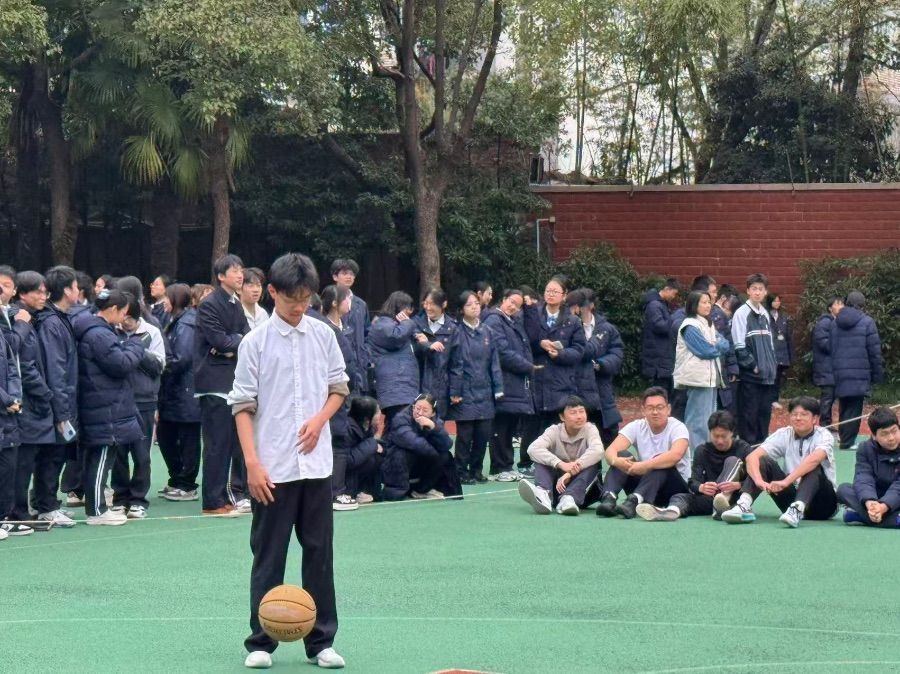 同学们里三层外三层地围在白线外,校服的藏青与各色外套交织成热闹的风景。有人举着手机对准赛场,生怕错过任何一个精彩瞬间;有人踮起脚尖张望,攥紧的手心满是紧张;连一旁的老师也笑着驻足,为选手们的每一次出手轻声喝彩。两个篮球安静地卧在脚边,像是在等待一场关于热爱的接力。